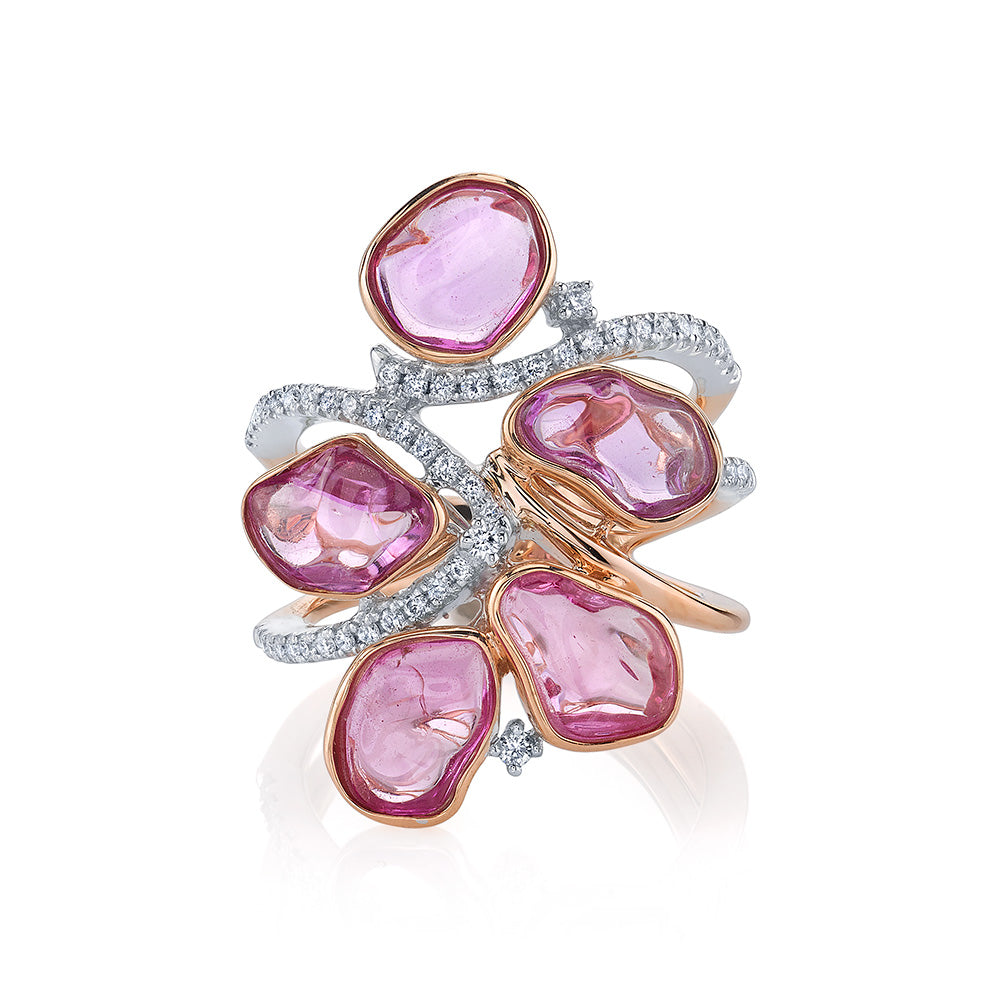 A scattering of bezel set natural tumbled sapphires in 18K rose gold nestled within brilliant white diamonds and gleaming high-polished gold.