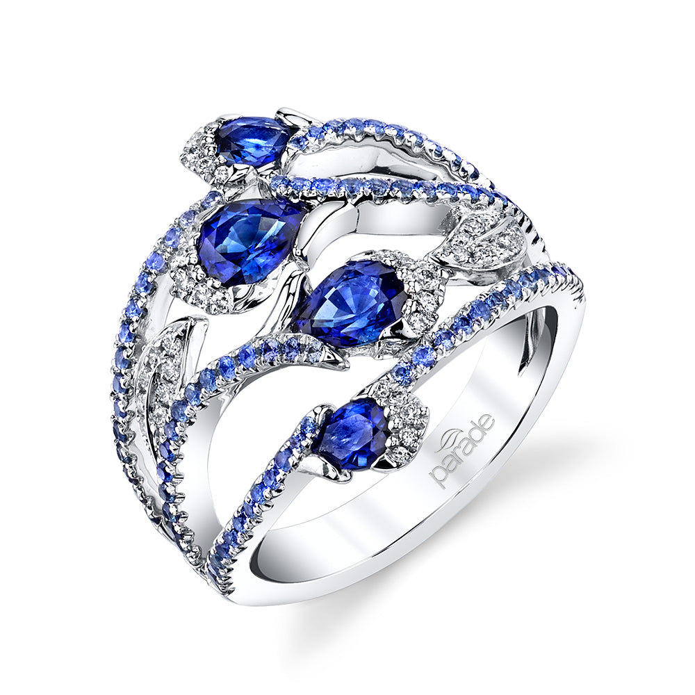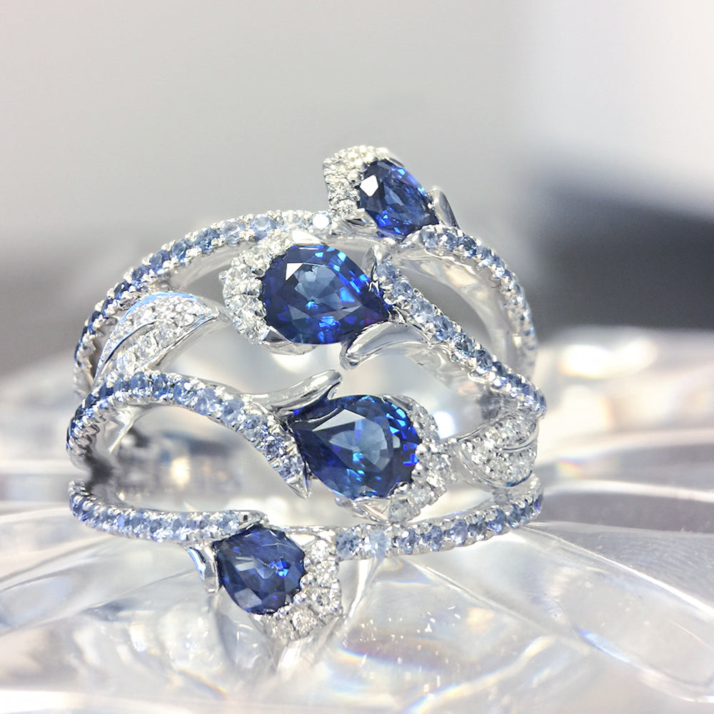 Vivid blue sapphire and white diamond blossom ring with carefully matched ombre band, set in gleaming 18k white gold.