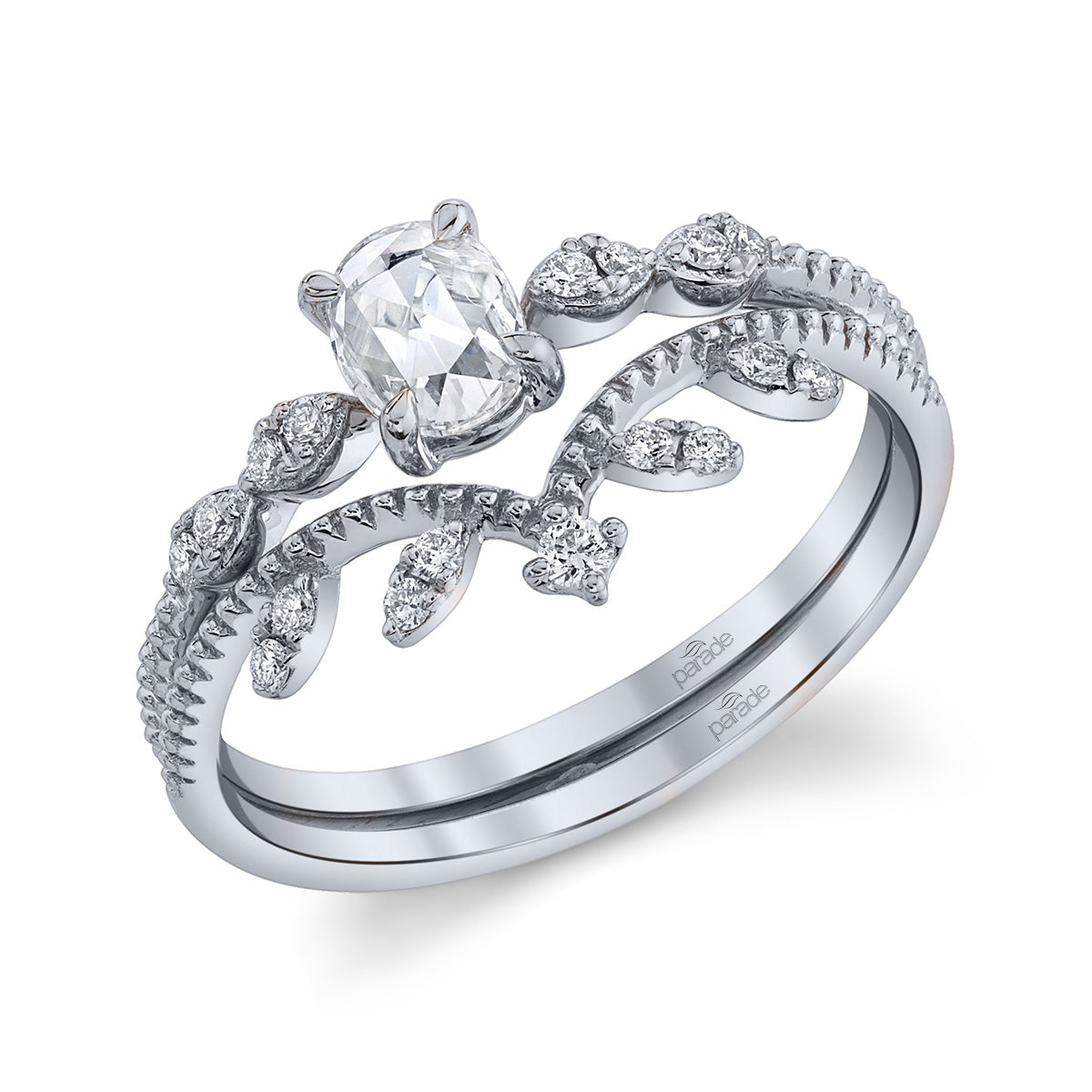 Unique yet elegant This rose-cut diamond bridal set features an oval center engagement ring with a sparkling diamond band and milgrain details set in 18k yellow gold. To complete the gorgeous look, a curved chevron diamond wedding band with matching milgrain detail is created to be paired with this oval rose-cut ring