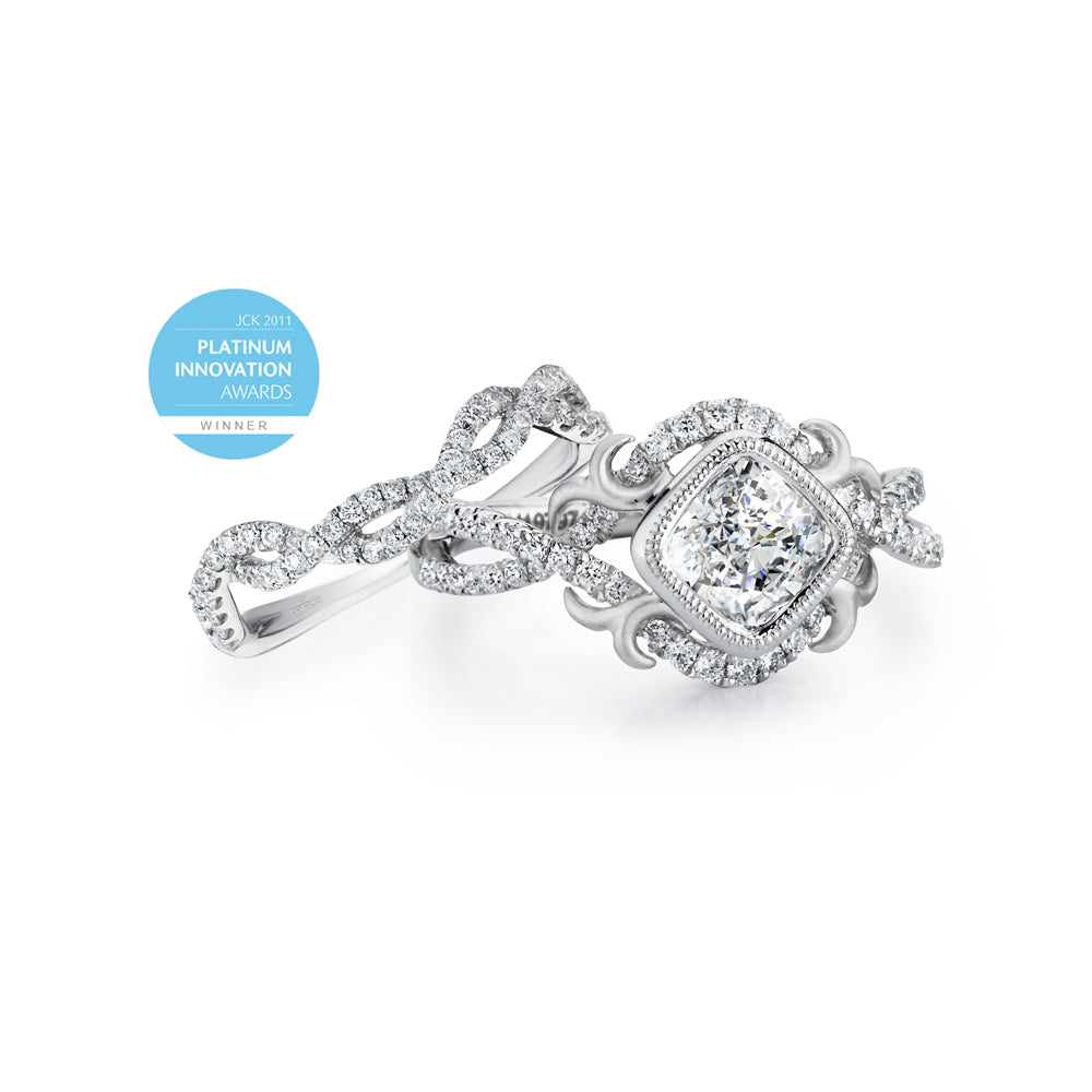 Gracefully intertwining rows of diamonds accentuate a cushion-cut diamond engagement ring.