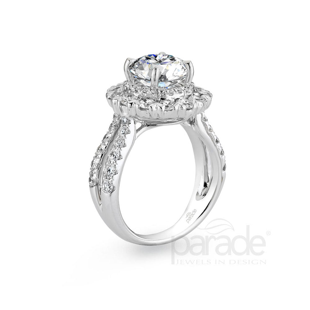 A diamond encrusted split band leads to a double halo circling a dazzling diamond in this bold style from the Hemera Collection.