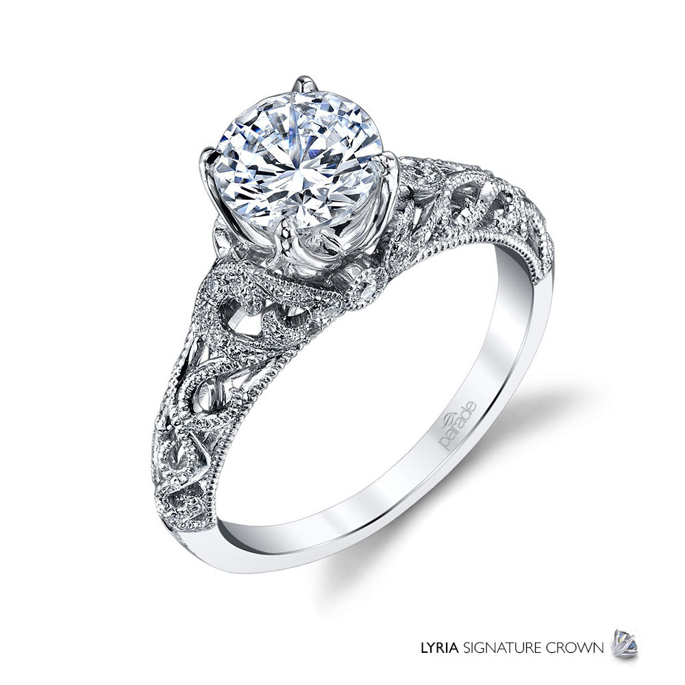 Intricate diamond set curls with fine milgrain detailing showcase a sparkling center stone, set in Parade's Lyria Signature Crown.