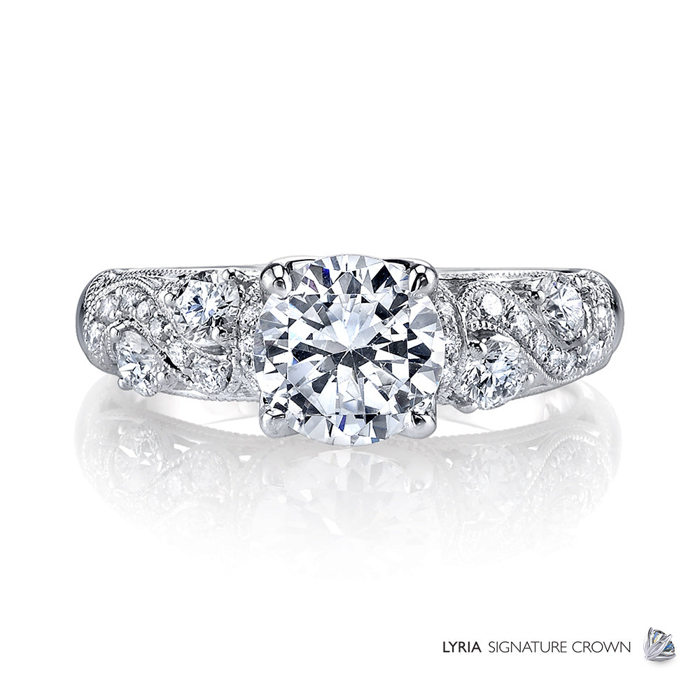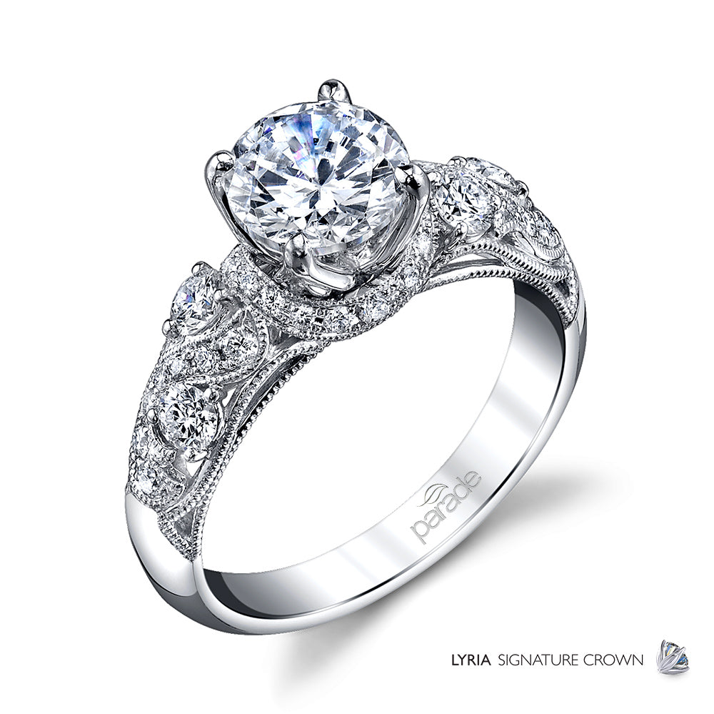 Milgrain etched art deco curves dance around bright diamonds, leading to a sparkling center stone in Parade's signature Lyria crown.