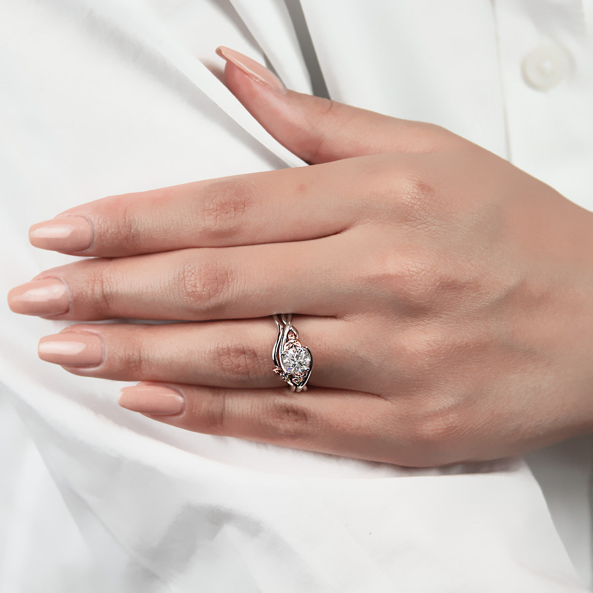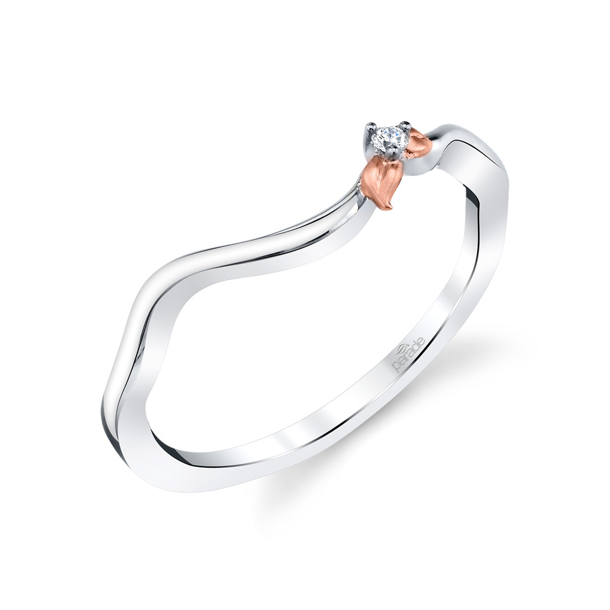 Soft petals of warm rose gold and a sparkling white diamond shines atop a winding branch of high polished 18K gold in this organic design from the Lyria Bridal collection.