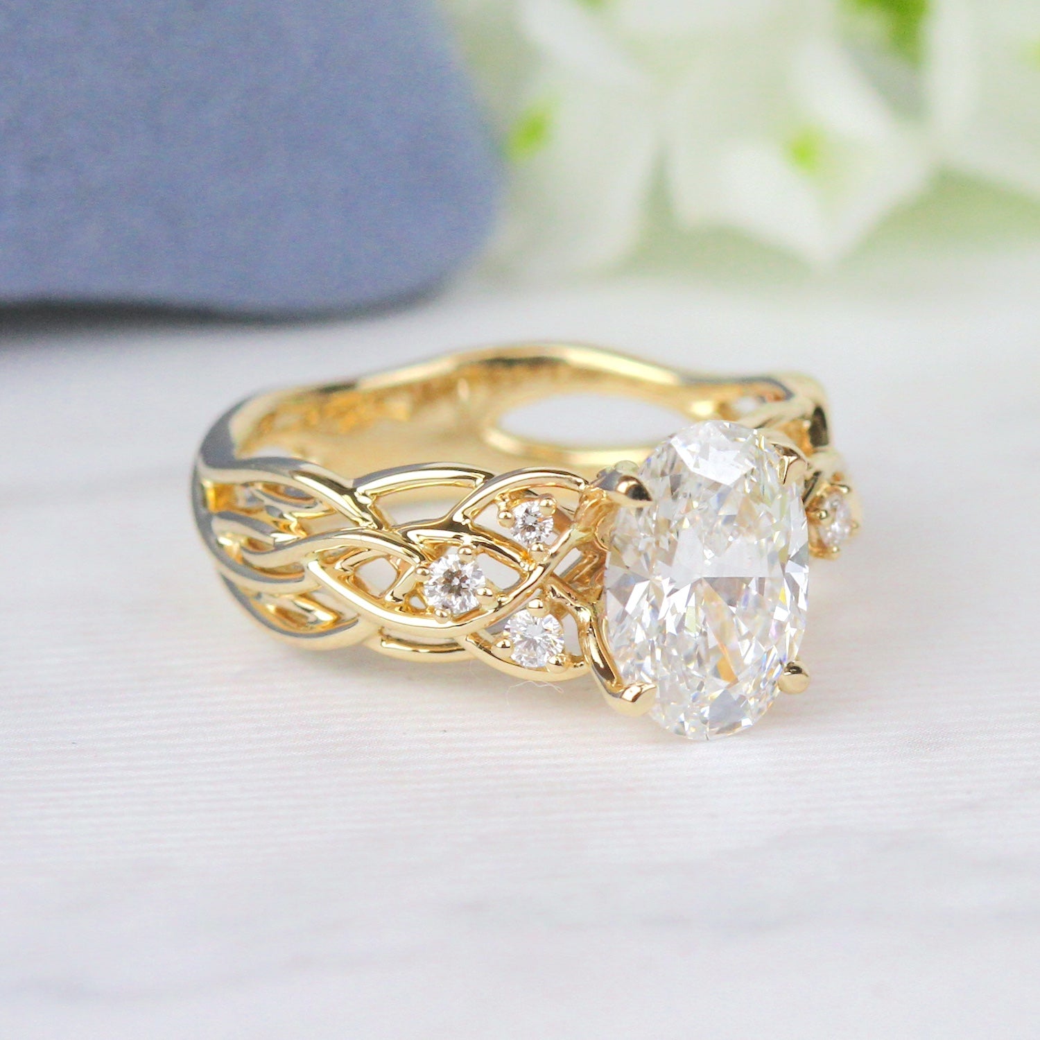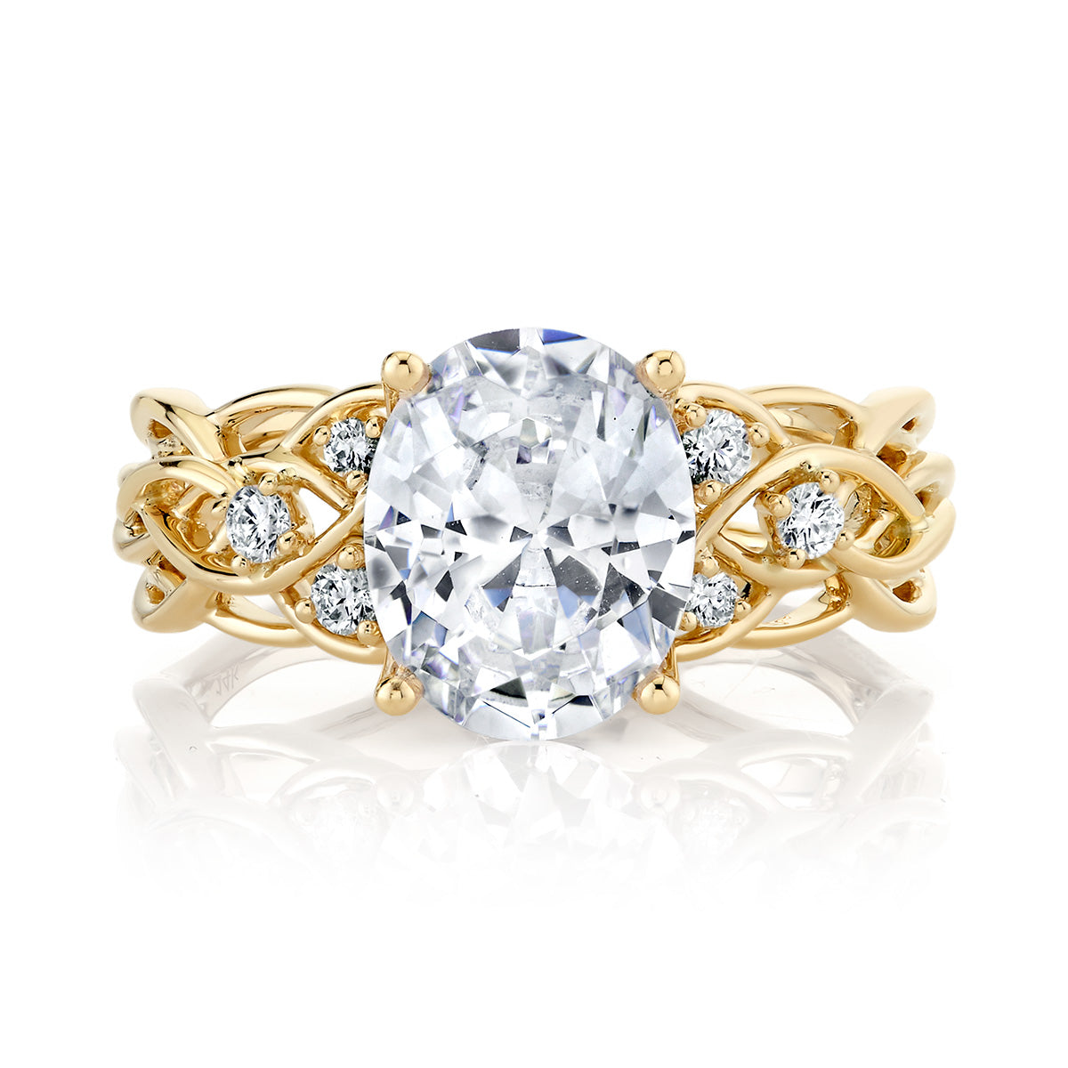 Yellow Gold Knot Accent Diamond Ring. Make a statement with this substantial yellow gold ring. Featuring an elaborate woven knot design accented with brilliant scattered diamonds. A unique, luxurious setting designed to highlight any oval center stone.
