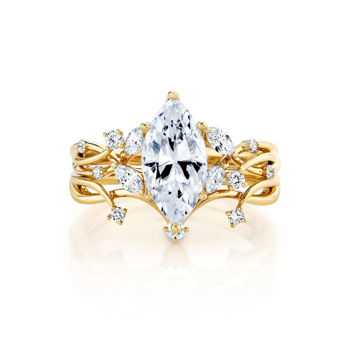 Yellow Gold Diamond ""Flowing Vine"" Ring. This yellow gold ring showcases a magnificent marquise center stone surrounded by a cluster of brilliant marquise and round diamonds that sweep across the finger like a delicate, sparkling vine.