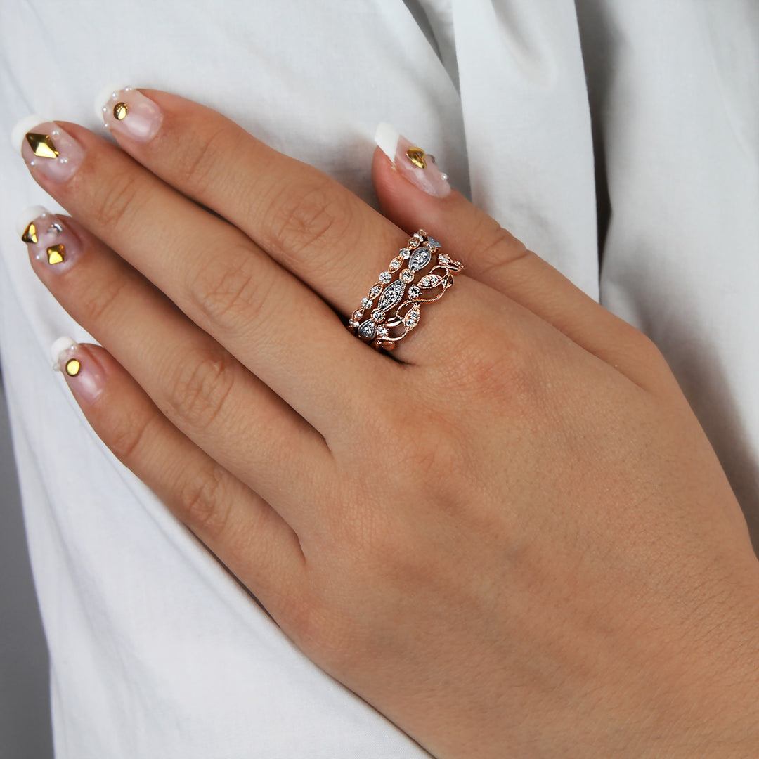 An eternity band of alternating round and marquise shapes set with sparkling white diamonds, finished with intricate milgrain detailing in this vintage inspired stackable band from the Charites Collection.