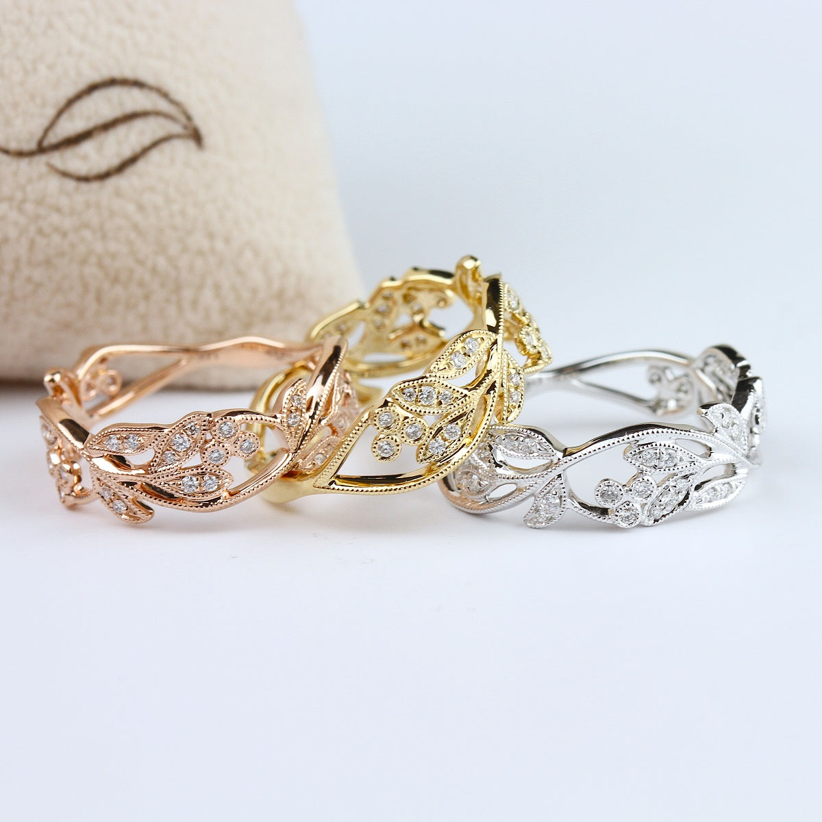 Milgrain detail and bezel-set diamonds accent the meandering vines and leaves of this romantic band from the Lyria Leaves Collection.