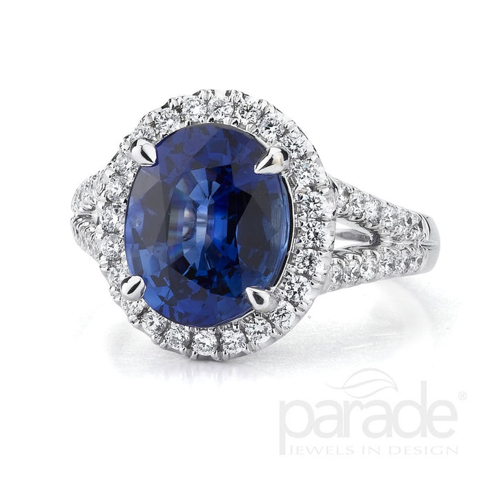 A classic diamond setting holds a vibrant 5.43 carat blue sapphire.