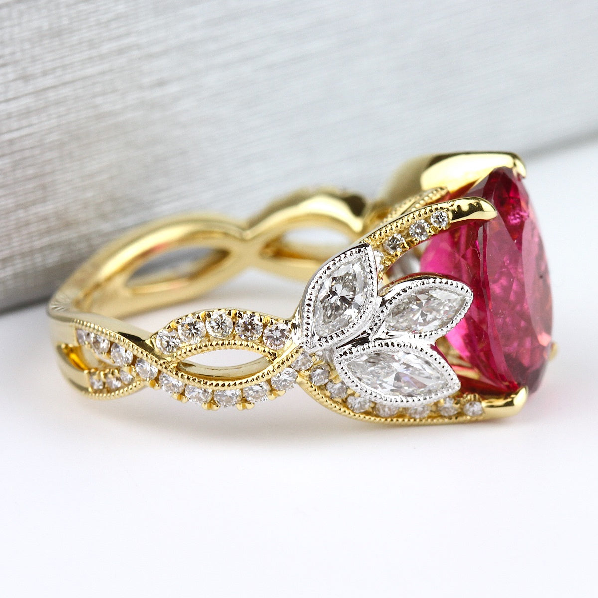 Meandering diamond-set vines and leaves showcase a vibrant 4.43 carat pink tourmaline.