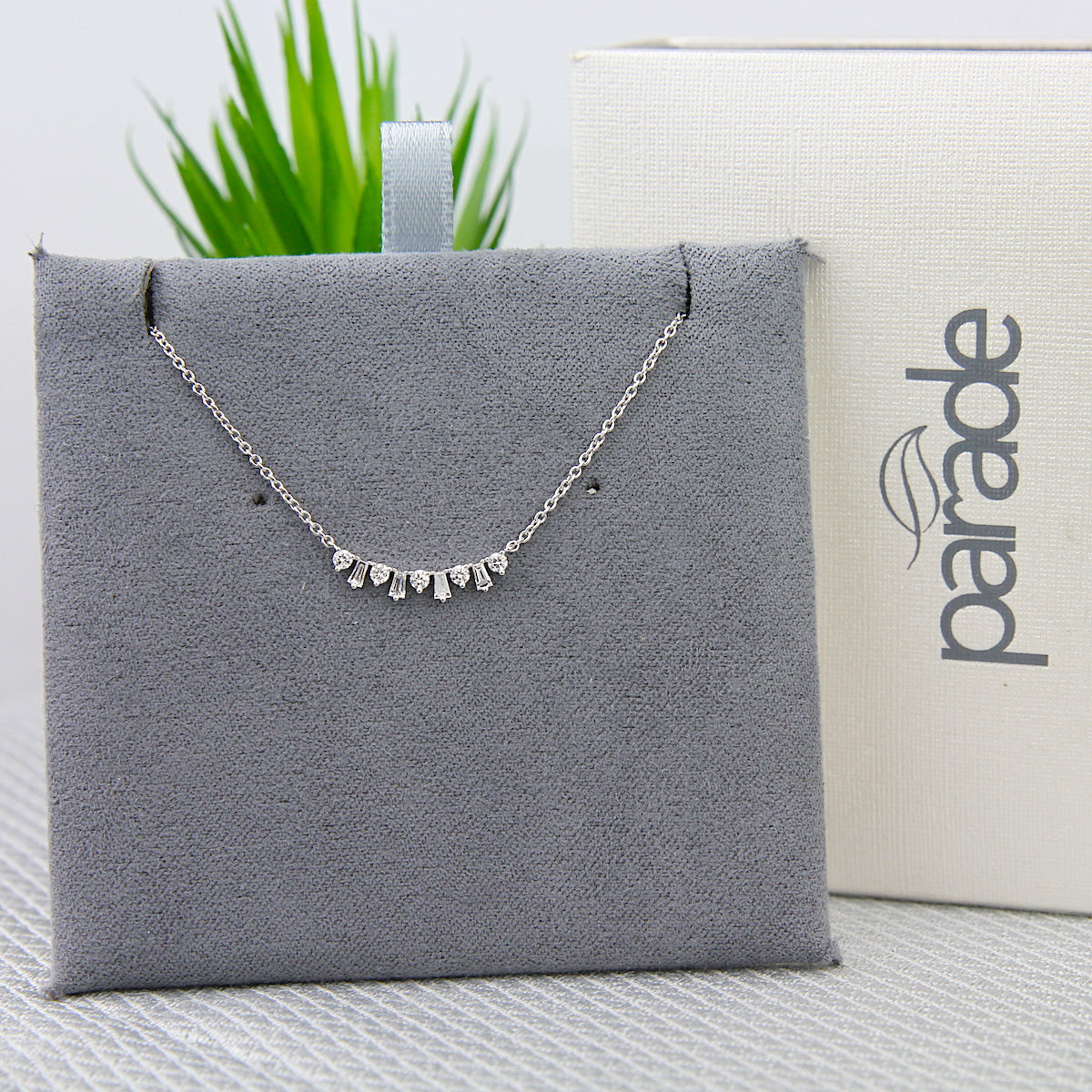 This tiara inspired necklace features alternating tapered baguette and round diamonds.