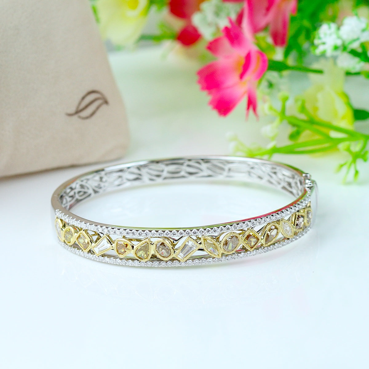 A playful mixture of fancy diamonds totaling 4.04 carats boasts a spectrum of colors including rich golden tones, deep amber and flashes of champagne, accented by sparkling white diamonds in this classic bangle.