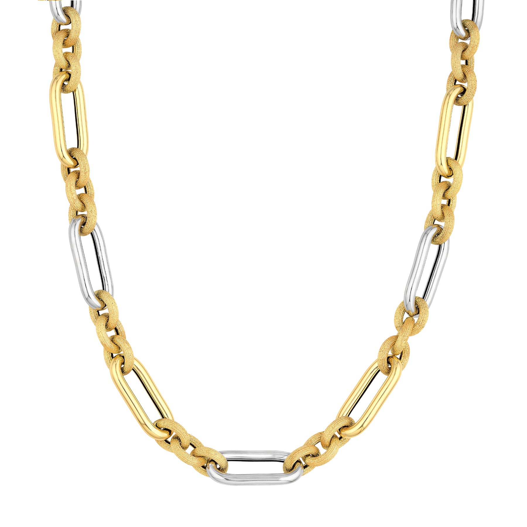 We combined luxury with nuance to create the chain of your dreams. This polished 14K white and yellow gold Paper Clip chain secures with a pear shape lobster lock.