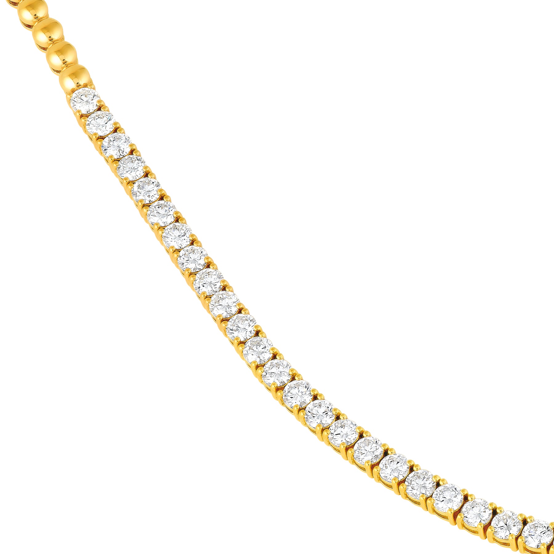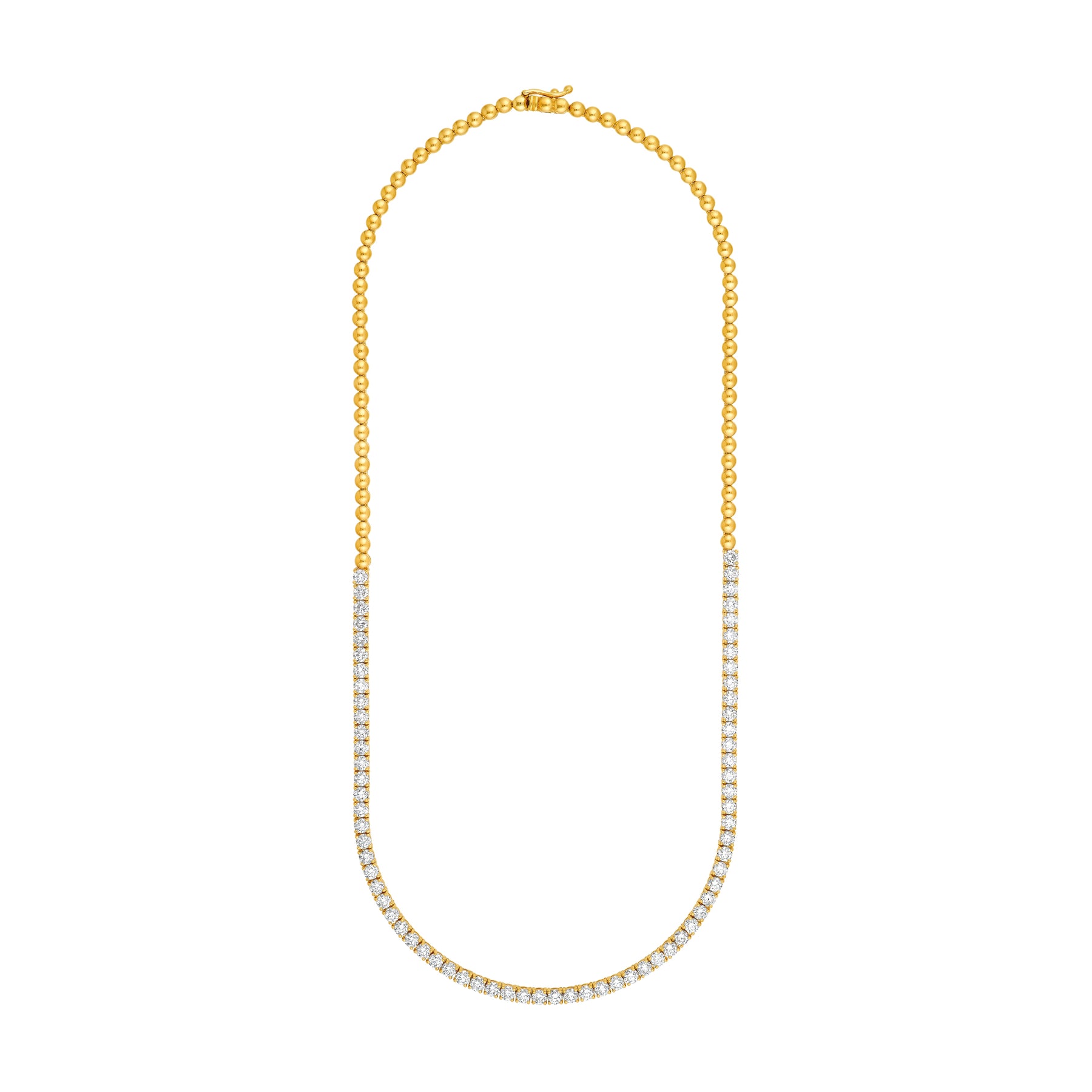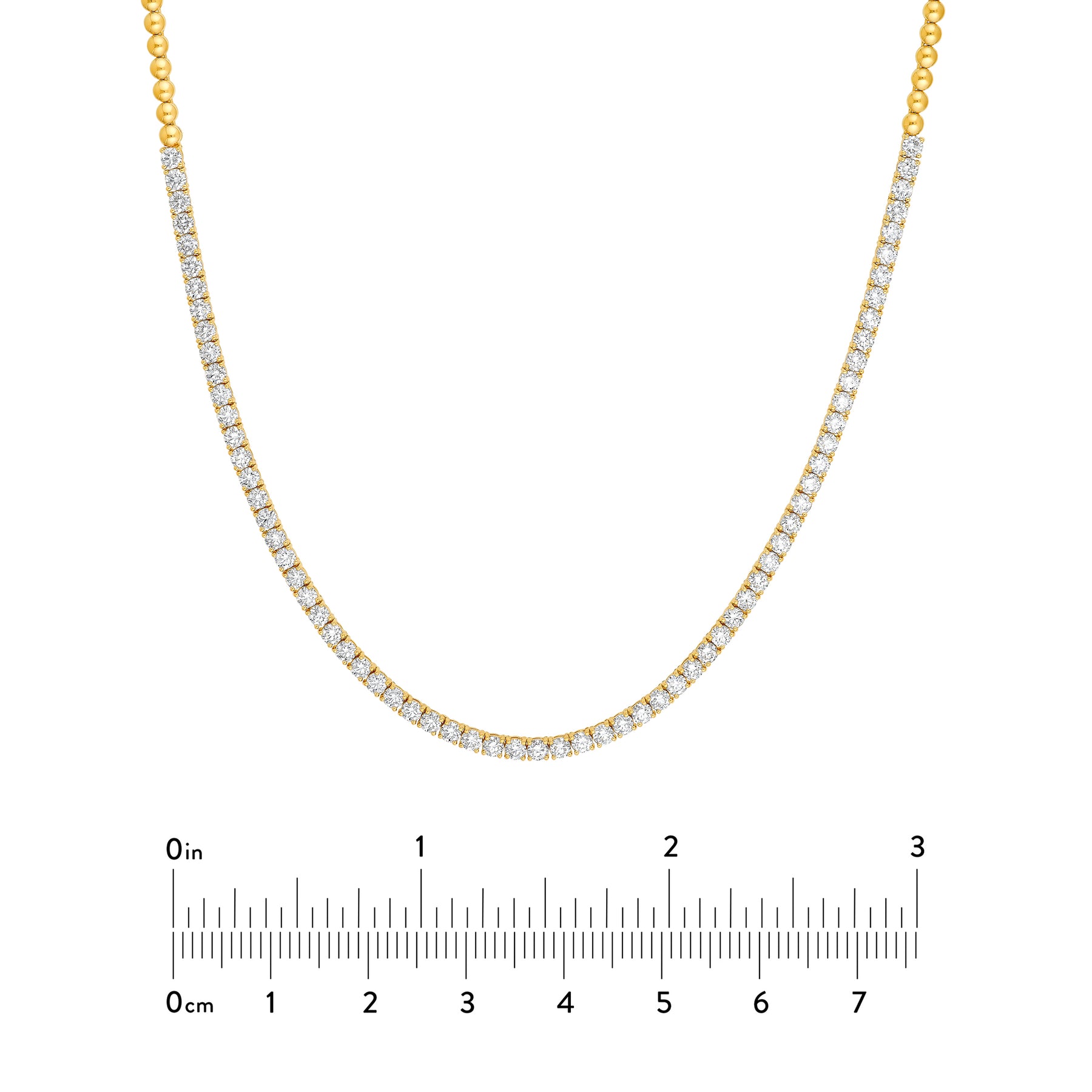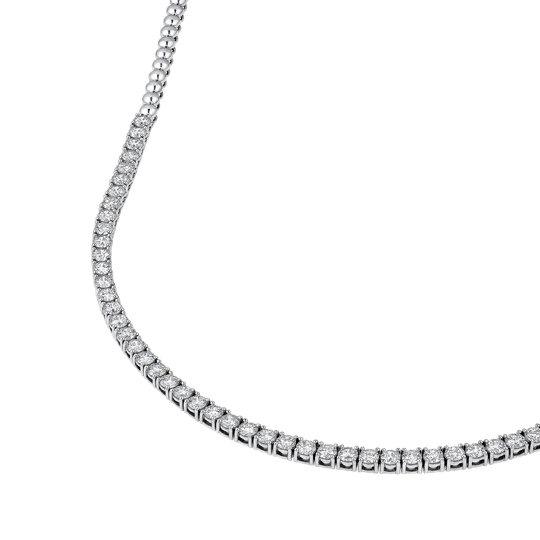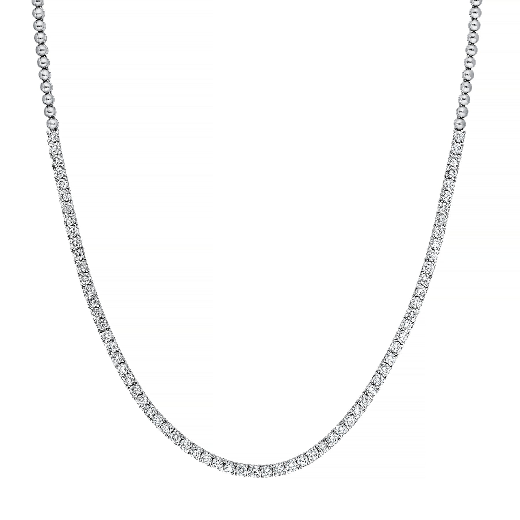 Experience timeless elegance with our straight Tennis Necklace. Set with brilliant 7tcw diamonds, this stunning piece offers effortless sophistication. This necklace is crafted in 14K white gold.