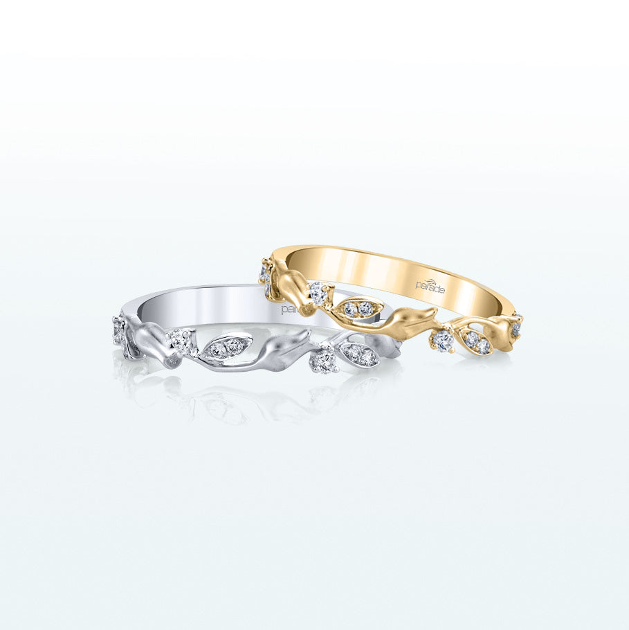 Golden blooms sprinkled with diamond leaves complete this yellow gold eternity band.