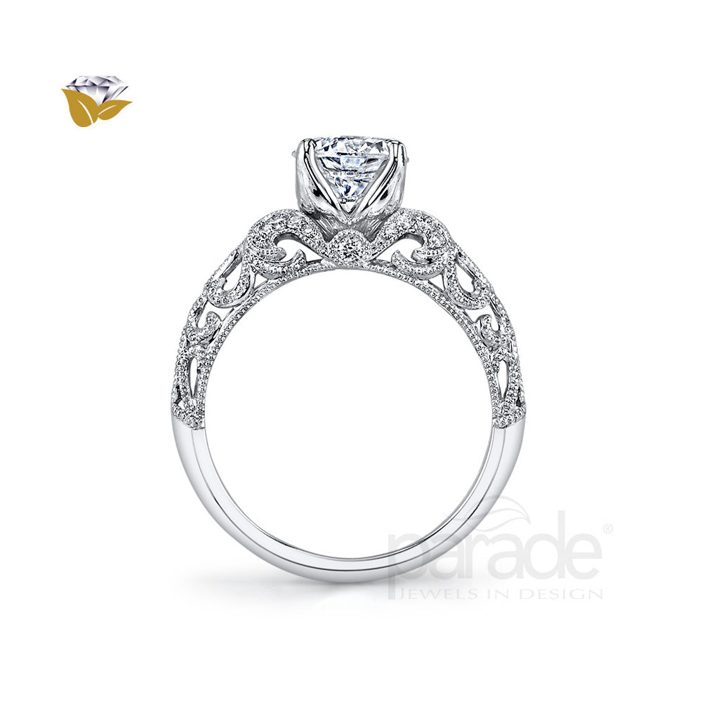 Intricate diamond set scrolls and marquise shaped windows with fine milgrain detailing showcase a sparkling center stone, set in Parade's Lyria Signature Crown.