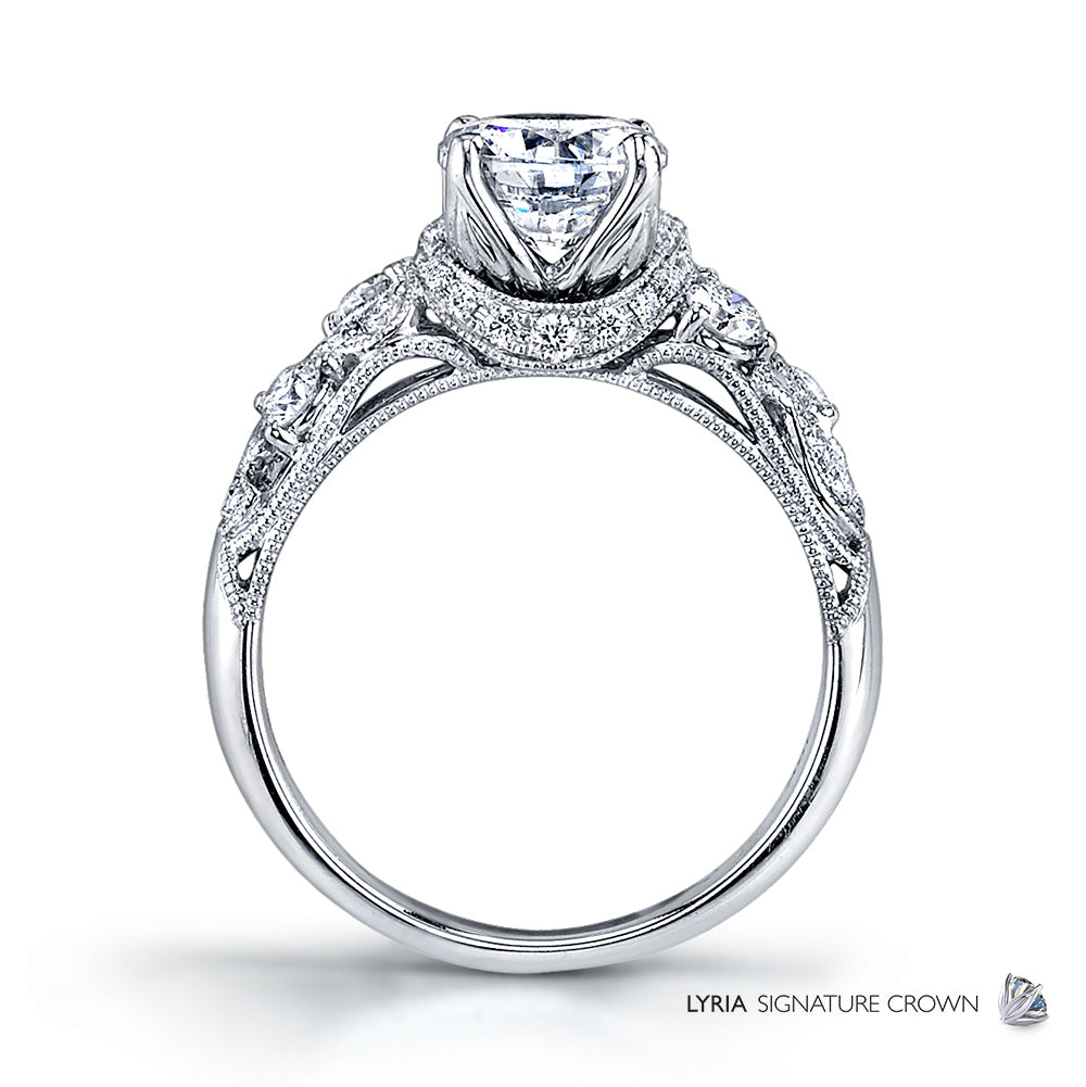 Milgrain etched art deco curves dance around bright diamonds, leading to a sparkling center stone in Parade's signature Lyria crown.