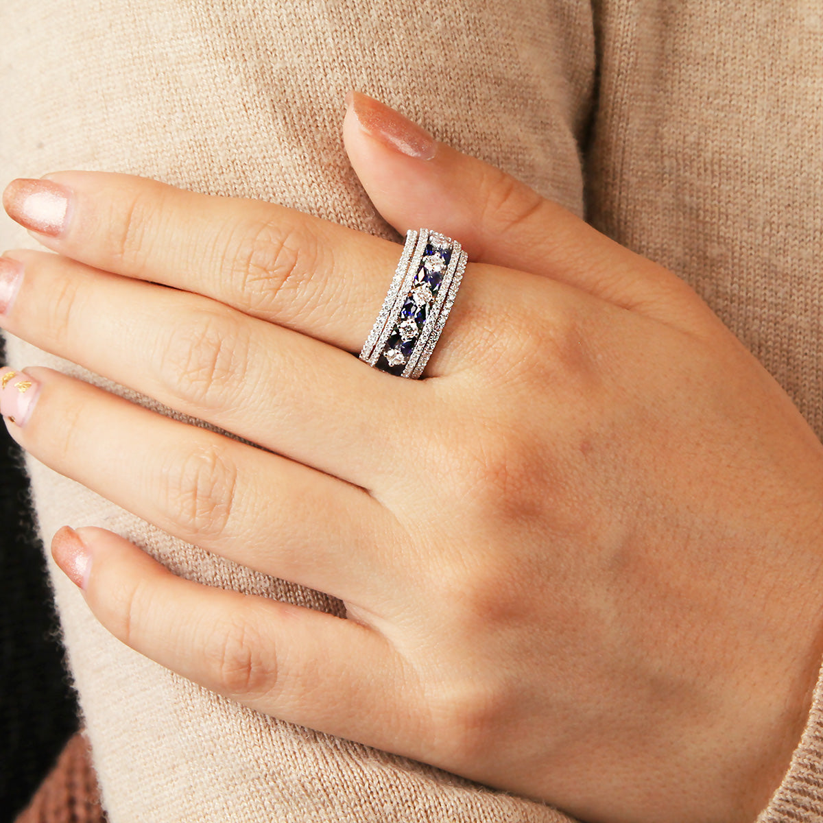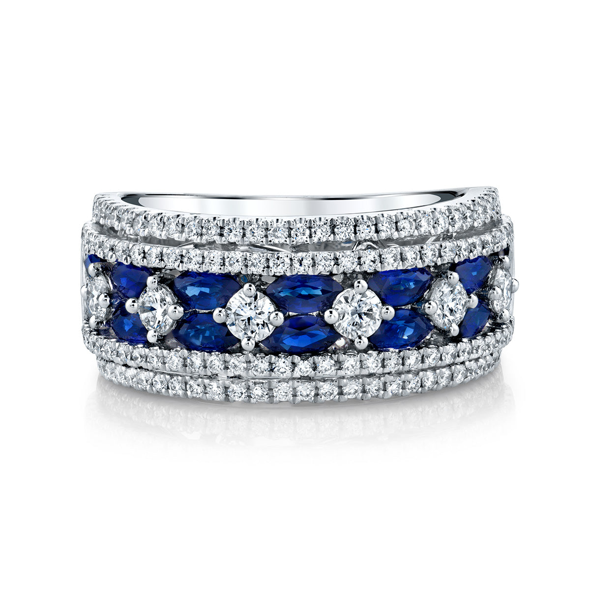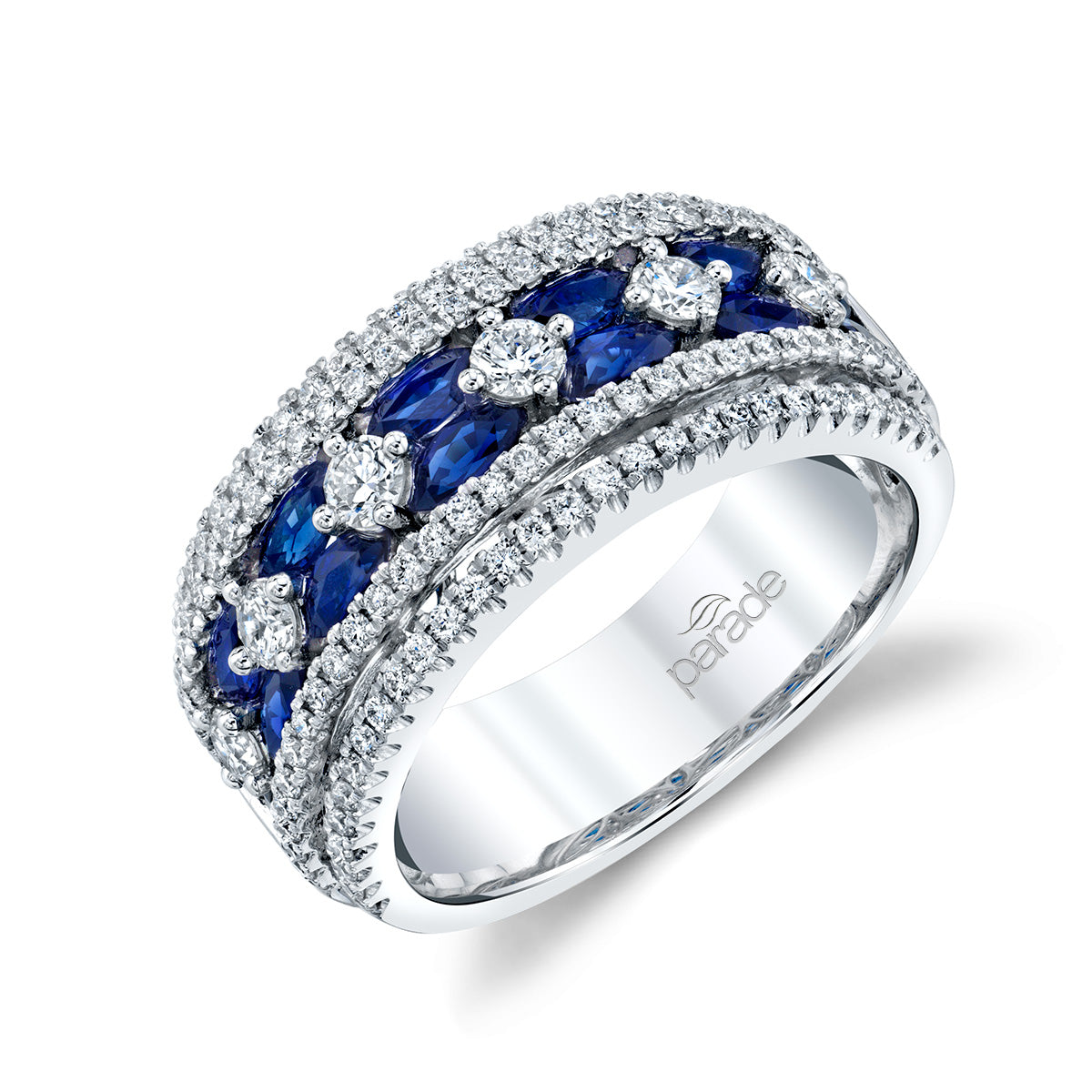 A sparkling band with two rows of pave diamonds form around bright and bold sapphires set between brilliant white diamonds form the Parade in Color Collection