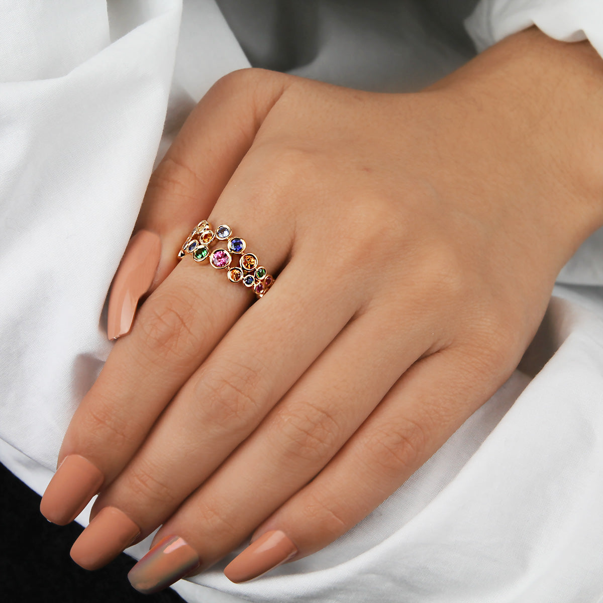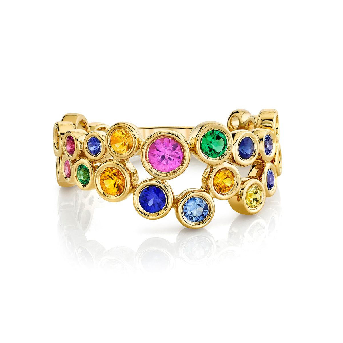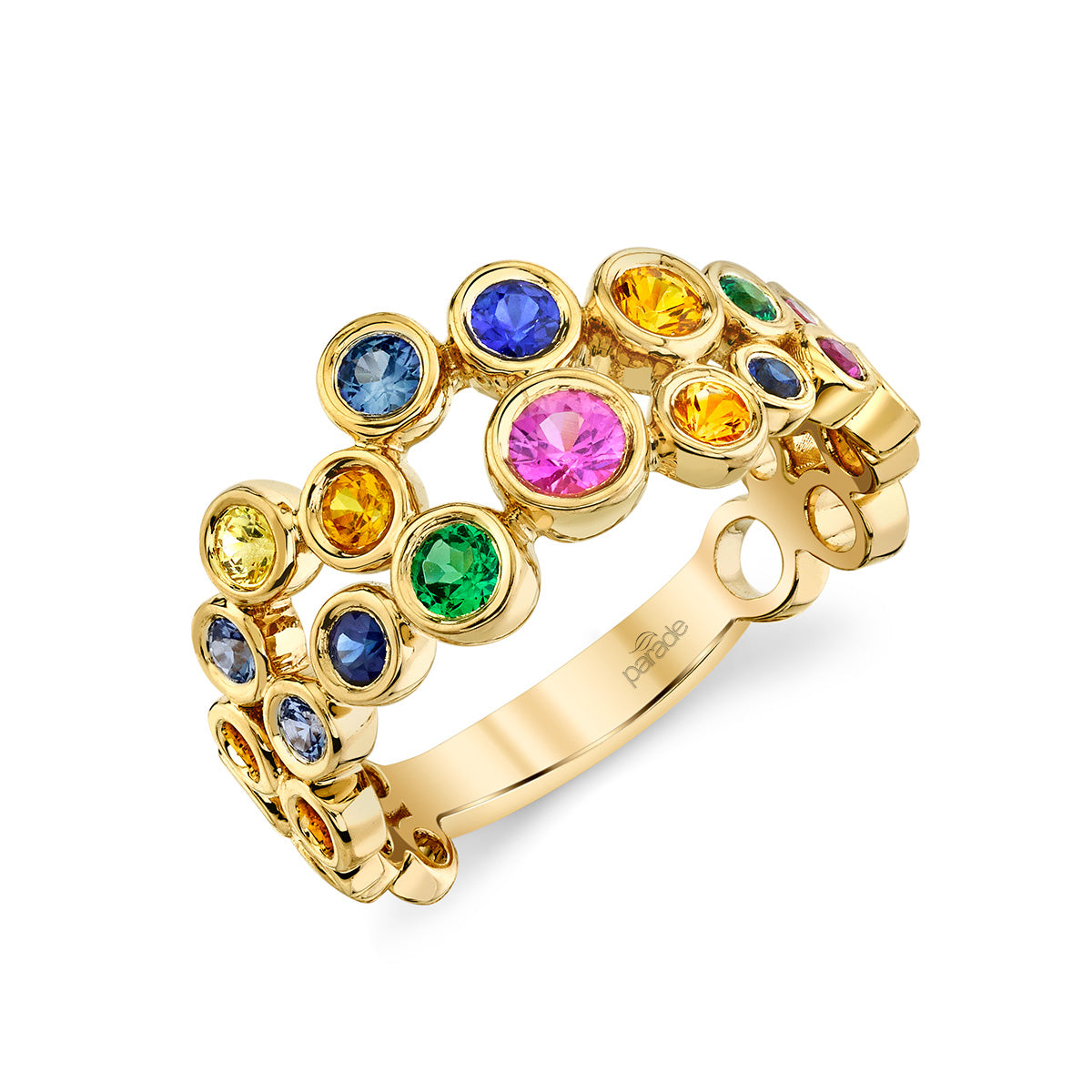 An exquisite variety of multi colored sapphires and tsavorites set in a gold band from the Parade In Color Collection.