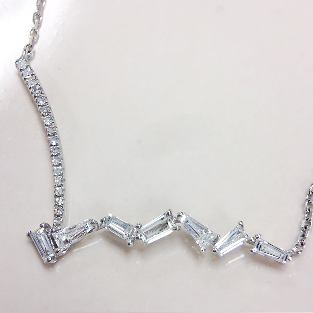 From the Parade in Fashion Collection, a stylish chevron of white round and baguette diamonds suspended from a fine link chain.