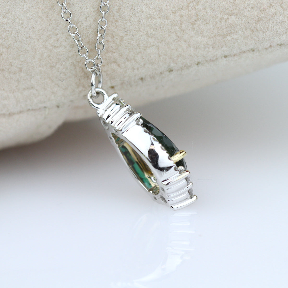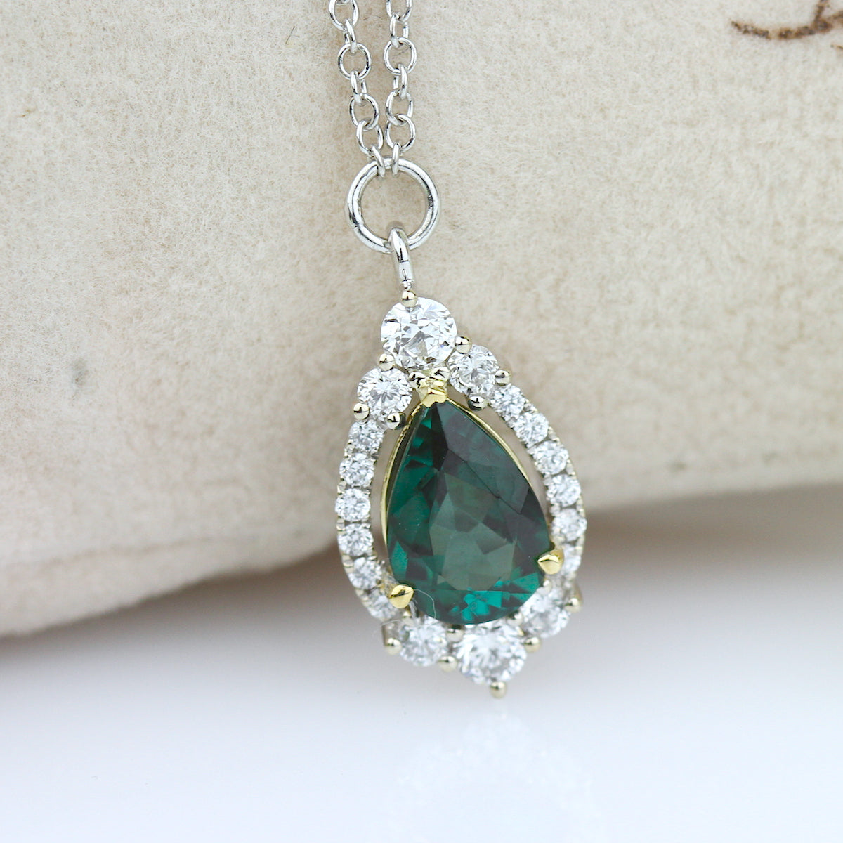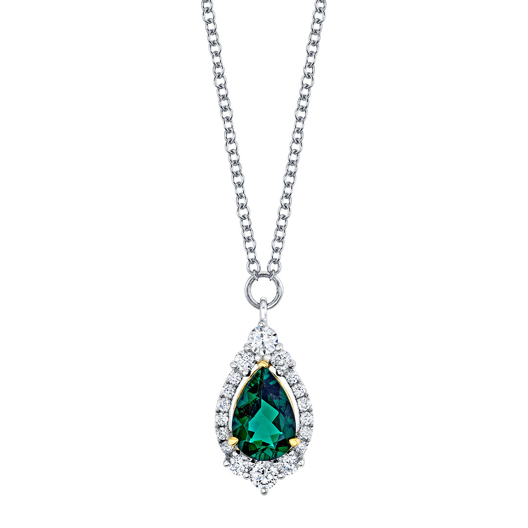 A majestic green tourmaline rests above a halo of graduating diamonds and floats from a lustrous gold necklace.