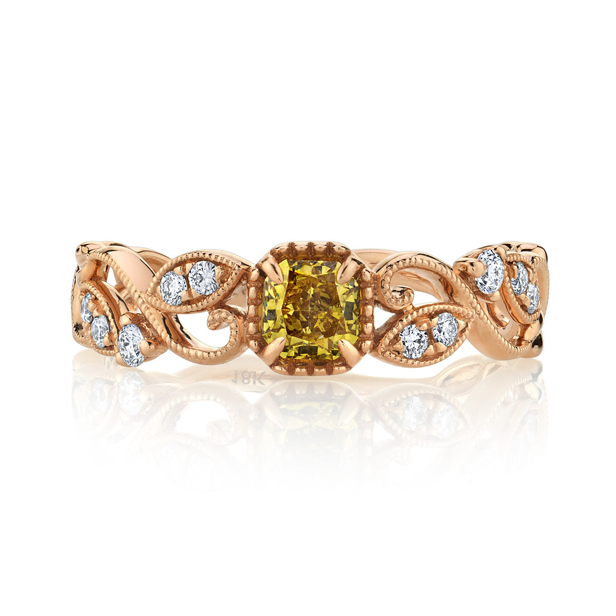 A gleaming band of diamond leaves weave towards a square colored diamond center in this design from the Lyria Leaves Collection.