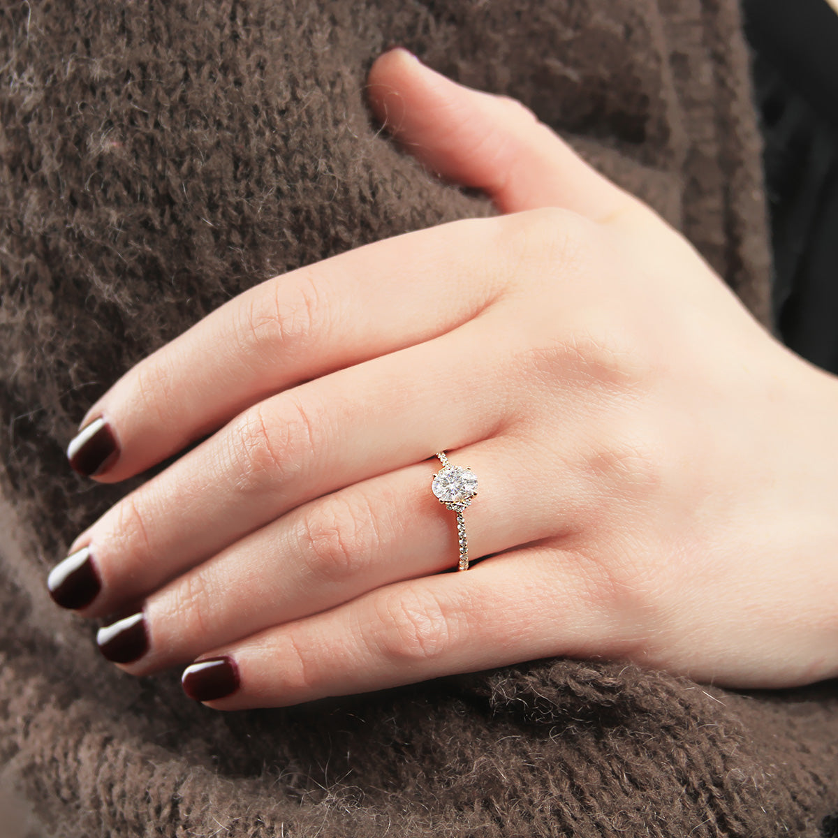 An oval brilliant center is accented with vertically set graduated diamonds on either side as well as halfway along the shank for an updated effect on a timeless piece.