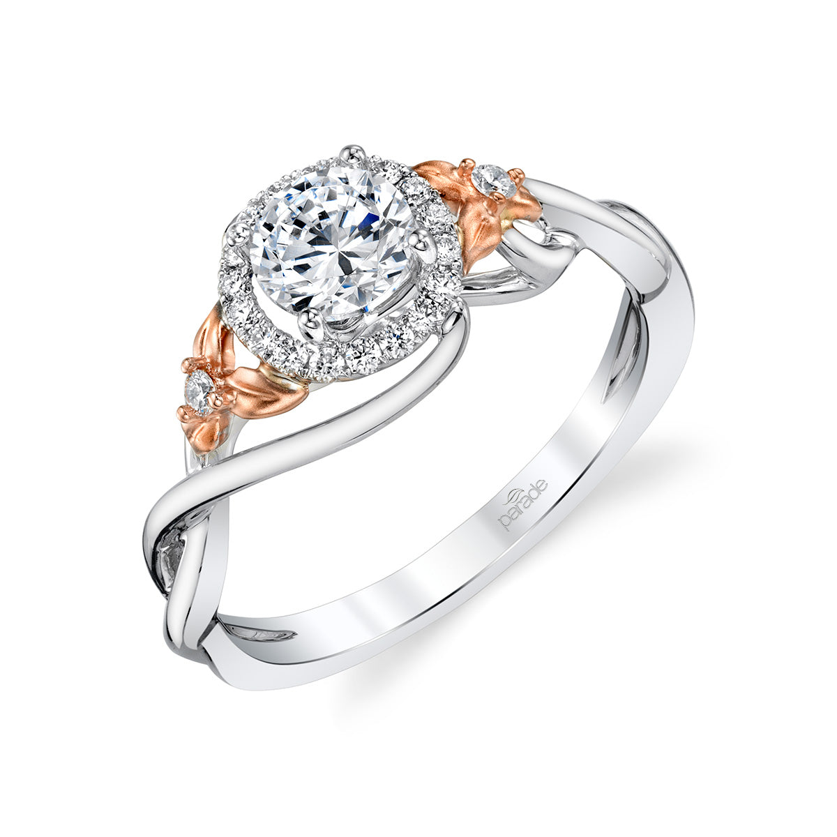 A brilliant center stone sits within a diamond halo atop soft petals of warm rose gold and sparkling white diamonds along intertwined branches of high polished 18K gold in this organic design from the Lyria Bridal collection.